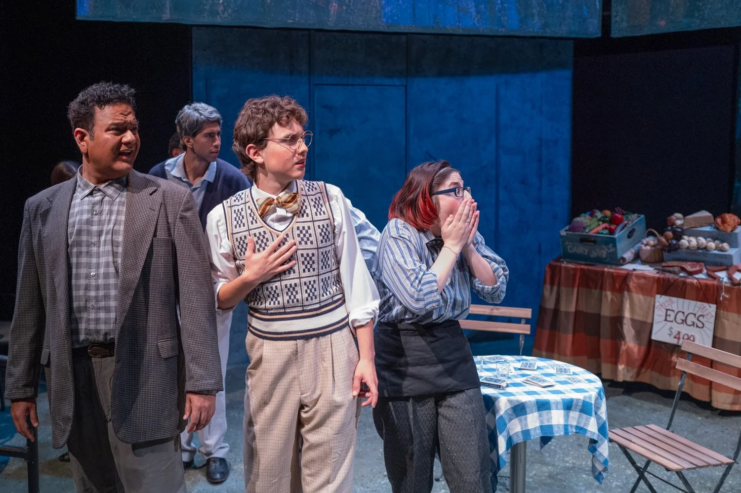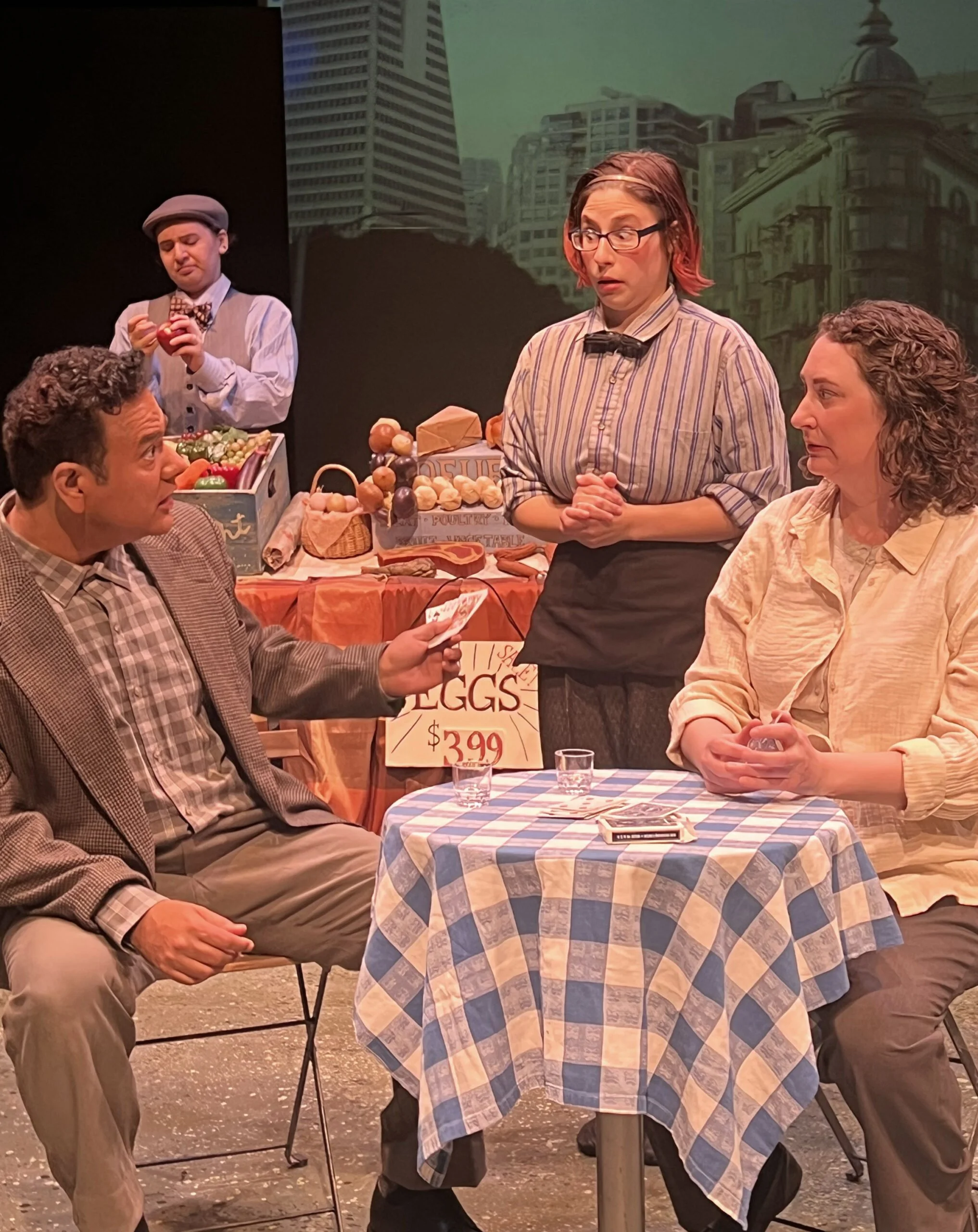 The stand in the show was built with a base covered in pleated plaid fabric. There were two handles on the sides of the tabletop, and the surface tilts forward so the audience can get a better view of the “food” displayed on it.
